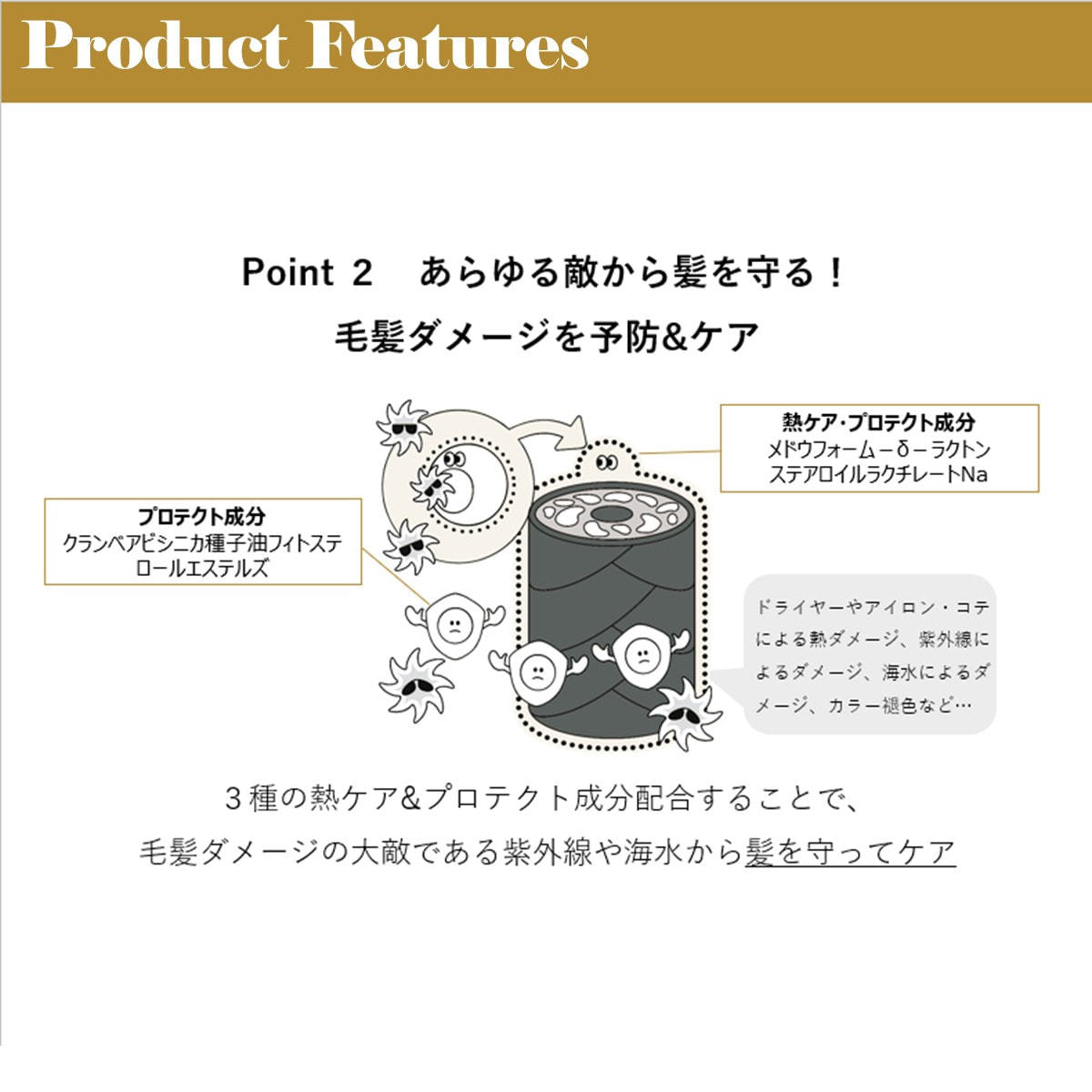PG、エタノール、水、ミリスチルアルコール、セトリモニウムクロリドベタインヒドロキシエチルウレア、バオバブ種子エキス、ゼイン、シクロヘキサン-1,4-ジカルボン酸ビスエトキシジグリコール、加水分解ケラチン(羽毛)、ベヘントリモニウムクロリド、イソステアリルグリセリル、ジラウロイルグルタミン酸リシンNa、乳酸、イソプロパノール、DPG、香料